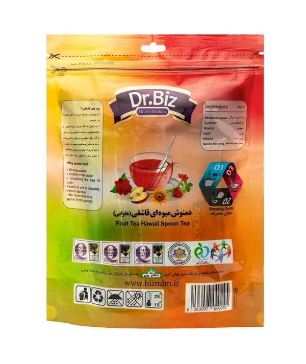 این دمنوش دکتر بیز شامل چای ترش، برگ توت فرنگی، سیب، گل آفتاب گردان، رزهیپ است.